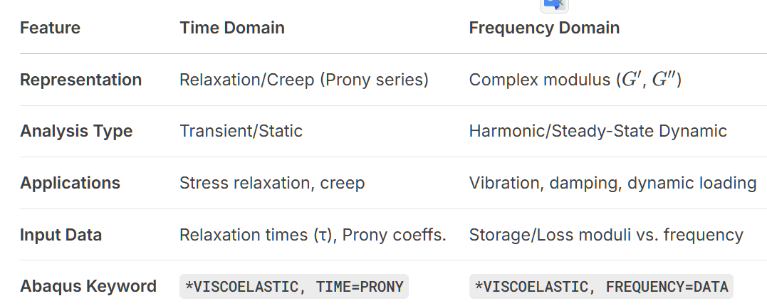 - Time Domain (Transient analysis) → Prony series for creep/relaxation.